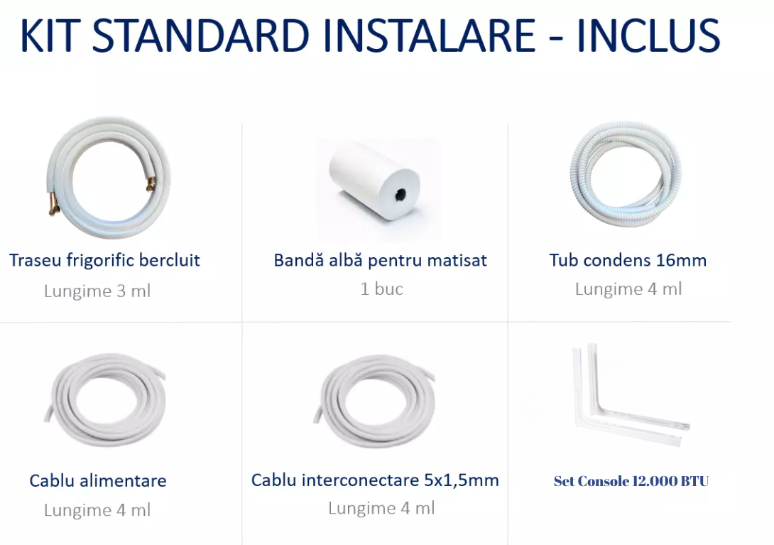 Odata cu produsul primiti cutia cu kitul pentru montaj aer conditionat, pachetul contine materiale si accesorii necesare instalarii - conform descrierii de mai jos: