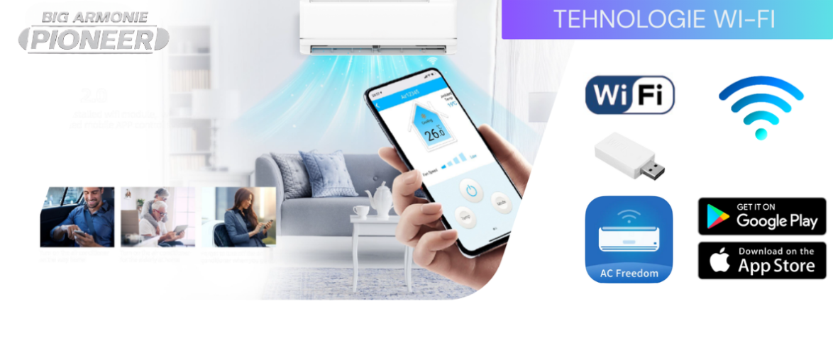 Functia Wi-Fi - Permite controlul aparatului de la distanta. Instaleaza aplicatia "AC Freedom" pe smartphone-ul tau si conecteaza aparatul la reteaua wireless cu acces internet.