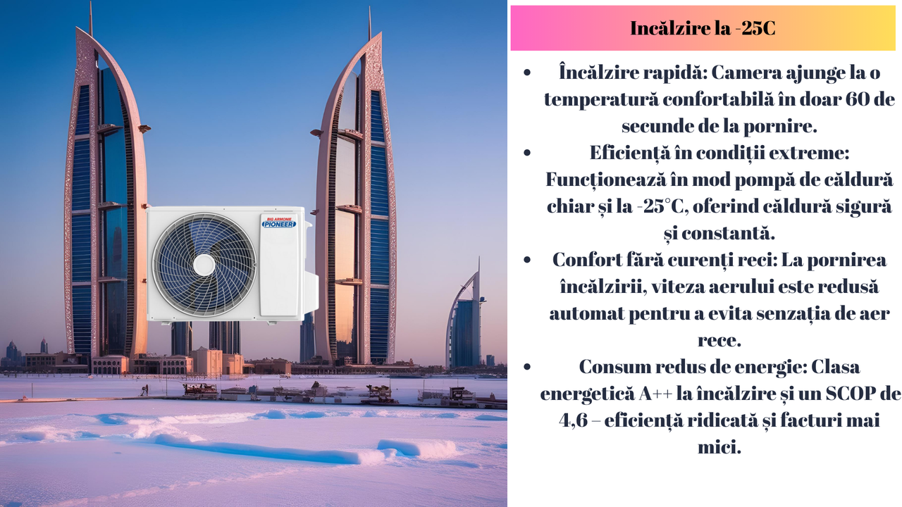 Chiar si atunci cand termometrul coboara sub -25°C, aparatele din seria Aero Elite continua sa livreze caldura eficient si rapid. Gandite pentru a face fata iernilor aspre, aceste unitati functioneaza fara probleme in modul incalzire la temperaturi extreme, oferindu-ti confortul necesar indiferent cat de frig este afara.