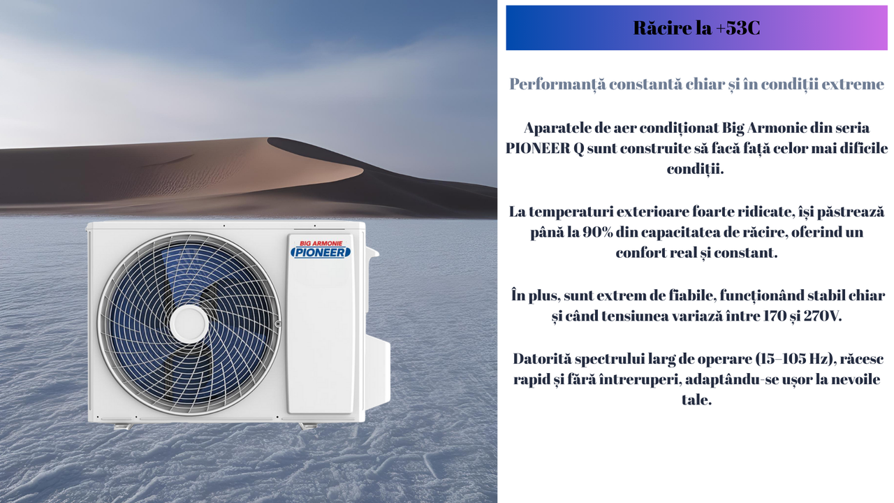Aparatele de aer conditionat din gama Big Armonie Q series fac fata fara probleme temperaturilor extreme. Datorita compresorului inverter de ultima generatie si intervalului larg de functionare (15–105 Hz), unitatile ofera o racire constanta, fara fluctuatii, chiar si atunci cand afara sunt peste 50°C. Capacitatea de racire ramane aproape de nivelul nominal – peste 90% – astfel ca ai parte de confort real, indiferent cat de caniculara e ziua.