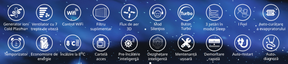 Control inteligent Wi-Fi Puteti controla aparatul de aer conditionat oricand si de oriunde, prin functia Wi-Fi, cu ajutorul aplicatiei specifice si a telefonului mobil inteligent. Modulul Wi-Fi nu necesita instalre, fiind integrat din fabrica in unitatea interioara. |